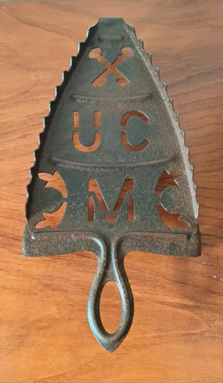 Soporte original para plancha antigua fabricado por Unión Cerrajero de Mondragón (UCM), reconocido taller vasco de fundición. Pieza de hierro fundido con diseño calado y emblemas característicos del taller. Ideal para coleccionistas, decoración rústica o para acompañar una plancha antigua. Conserva su pátina original y está en muy buen estado para su antigüedad.