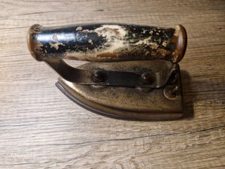 Plancha antigua de metal con mango de madera. - Diseño clásico. - Material de metal resistente. - Mango de madera para un agarre cómodo.