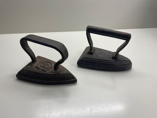 Conjunto de dos planchas antiguas de hierro, perfectas para coleccionistas o decoración. - Material: Hierro fundido. - Diseño clásico. - Mango curvo para un agarre firme.