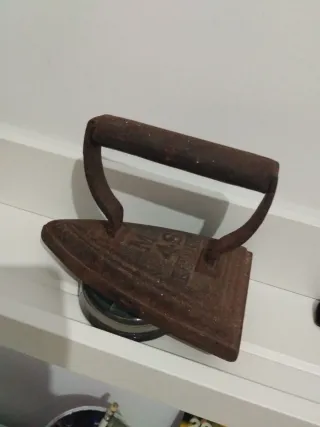Preciosa plancha antigua de hierro, ideal para decoración o coleccionismo. Se encuentra en buen estado de conservación. - Plancha de hierro fundido. - Diseño antiguo con detalles decorativos. - Asa de madera. - Pequeño pájaro decorativo en la parte superior.