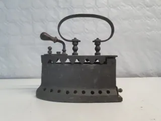 Plancha antigua de hierro fundido, con un diseño clásico y robusto. - Material: Hierro fundido. - Color: Negro.