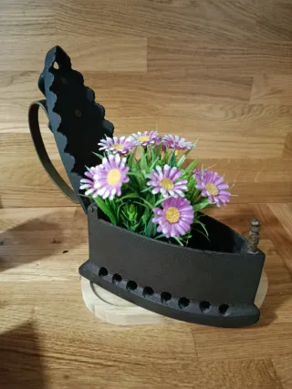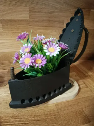 Preciosa plancha antigua del e carbón de hierro, ideal para decoración, con mando de madera. Se encuentra en muy buen estado. Mide 9 cm y medio de ancho 21 cm y medio de largo 25 cm de alta. Pesa 3 kilos. Original de Alemania Se vende con las flores - Diseño antiguo con detalles decorativos. - Perfecta para darle un toque vintage a tu hogar. - Pieza única para coleccionistas.