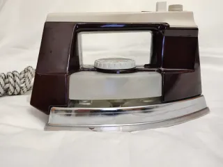 Plancha de viaje antigua de color burdeos y blanco. Un accesorio retro con dial selector. - Diseño vintage. - Dial selector con números.