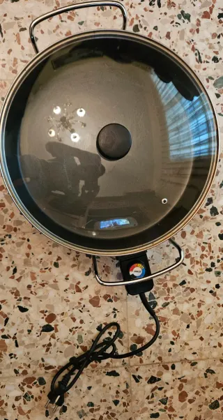 Olla/paellera multiusos eléctrica de 1840w 215ª en buen estado con regulador de potencia, teflón Dupont, Asas que no se calientan, gran capacidad, perfecta para hacer paellas, pizza, guisos también se puede utilizar como plancha para carne, verduras, para cocer pasta, se puede usar en cocina, jardín, camping, fácil de transportar. Diámetro 35cm, manual de instrucciones y caja original. - Ideal para cocinar diversos platos. - Fácil de limpiar. - Perfecta para una cocinamoderna.
