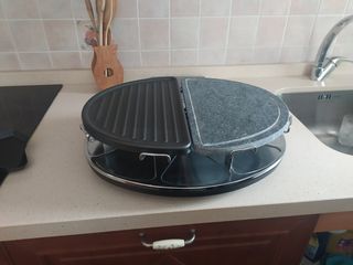 Parrilla eléctrica Raclette KZAI nueva. Ideal para preparar comidas deliciosas y fáciles. - Plancha de acero inoxidable. - Parrilla con capacidad para 8 personas. - Incluye placa metálica y placa de piedra. Desmontable para facilitar su limpieza. 1300W - Control de temperatura.