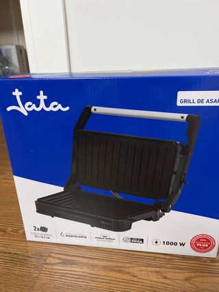 Plancha grill Jata de doble uso, ideal para asar todo tipo de alimentos. - Placas estriadas de 23 x 14,5 cm. - Tapa superior basculante. - Apertura de 180 grados. - Libre de PFOA. - Potencia de 1000 W.