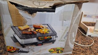 Plancha Raclette Princess en buen estado. Ideal para preparar deliciosas recetas. - Superficie de piedra. - Incluye 4 sartenes pequeñas. - Fácil de limpiar. Las sartenes han perdido la aderen ia pero la piedra para hacer la carne a la plancha está perfecta
