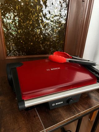 Plancha de asar Bosch en color rojo. Ideal para preparar tus comidas favoritas. - Fácil de usar y limpiar. Rueda de reenvio Piernas Placas desmontables Bandeja recogegrasa Fácil de limpiar Partes de platos a prueba de agua Indicadores LED Poder
