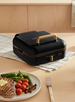 CREATE/STONE STUDIO PRO/Grill multifunción, negro. Revestimiento antiadherente, 3 temperaturas de cocción diferentes, de 60ºC a 200ºC. Podrás ajustar su placa superior en 100º o 180º dependiendo de la receta que quieras hacer. Cuando la cocción sea en 180º podrás incluir más alimentos en su parrilla y así reducir el tiempo de cocinado. Es adecuada para cocinar todo tipo de carnes, pescados, verduras, etc. Podrás preparar 2 recetas diferentes a la vez gracias a sus dos placas de cocción. Medidas 24,4 x 28,6 x 15,4. SIN ESTRENAR!!