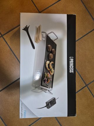 Plancha eléctrica raclette nueva a estrenar. Incluye dos planchas pequeñas y una grande (20x10cm). Además incluye apoyadores de madera para las planchas y una espátula de madera. La plancha es de hierro fundido con antiadherente. Apto para lavavajillas. La caja está dañada pero la plancha está nueva.