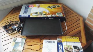 Vendo plancha cocina de la marca Princess, modelo classic table chef 2200. Se ha usado muy poco, tiene todos sus componentes, incluido la caja. Funciona perfectamente, sus dimensiones aproximadas son 46x26 cm. Potencia 1500W. Tiene libro de recetas de cocina manual de uso. Gastos de envío no incluidos.