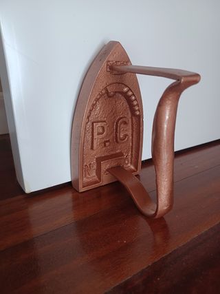 En hierro fundido P.C. Nº4, procedente de Francia, restaurada y pintada en un atractivo color cobre que resalta su silueta clásica. Para garantizar su conservación, se le ha aplicado una capa de barniz protector que preserva la pintura y aporta durabilidad. Medidas aproximadas: 15 x 8,5 x 10,5 cm Peso: 1.021 g Fabricada entre finales del siglo XIX y principios del XX, corresponde a las planchas tipo lingote calentadas al fuego para planchar la ropa. Hoy se convierte en un objeto decorativo único: ideal para dar un toque vintage, rústico o industrial, servir como pisapapeles, tope de puerta con estilo o pieza llamativa.
