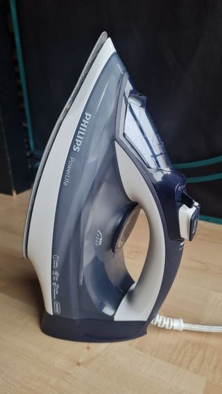 Plancha de vapor Philips en color azul y blanco. Ideal para el cuidado de la ropa. - Depósito de agua transparente. - Base deslizante para un planchado fácil. - Control de temperatura ajustable.