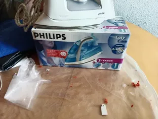 Plancha de vapor de la marca Philips en color azul. Ideal para el cuidado de la ropa. está prácticamente nueva. hay más cosas en mi perfil - Depósito de agua. - Base deslizante. - Cable de alimentación.