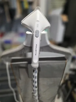 Plancha de vapor vertical de la marca Rowenta. Ideal para alisar prendas de ropa de forma rápida y eficiente. - Mango ergonómico para un agarre cómodo. - Manguera flexible para facilitar el movimiento. - Base estable para mayor seguridad.