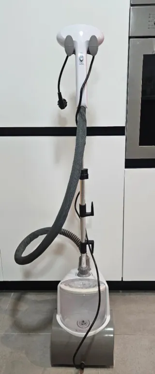 Plancha de vapor vertical con base y 9 puntos de emisión de vapor. Consigue una ropa perfectamente planchada gracias a su sistema de planchado en vertical con vapor continuo. Además, dispone de un tubo telescópico de altura ajustable y una boquilla/cepillo especial para pantalones. Es apta para planchar la mayoría de tejidos y prendas. Está nueva, usada solo un par de veces.