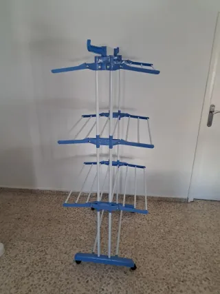 Tendedero de ropa con estructura de aluminio y detalles en plástico azul. Cuenta con múltiples niveles para colgar la ropa y alas laterales. - Materiales: Aluminio y plástico. - Diseño de múltiples niveles. - Alas laterales para colgar. 170 altura x75 largo x 64 ancho Se puede desmontar y su caja no ocupa apenas sitio