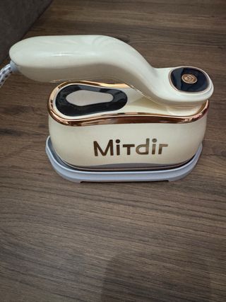 Plancha de vapor vertical de la marca Mitdir. Su diseño es elegante y compacto, ideal para el cuidado de la ropa. - Color crema con detalles dorados. - Base de apoyo incluida. - Mango ergonómico. - Caja original.