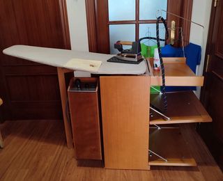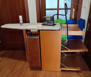 Mesa de planchar con armario y cajonera, ideal para guardar la plancha y la ropa. Está en buen estado y es muy práctica. - Incluye tabla de planchar. - Armario para guardar la plancha y otros accesorios. - Cajonera con dos cajones para guardar ropa. - Estructura de madera.