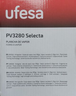 Plancha de vapor Ufesa PV3280 Selecta en color azul y blanco. Diseñada para un planchado eficiente.Plancha con total comodidad, con la plancha de vapor Ufesa PV3280, de color azul y blanco, para que tu ropa esté siempre perfecta. Stop arrugas Hasta las arrugas más difíciles se podrán eliminar con la plancha . Su potente golpe de vapor de 180 g/min hará desaparecer las arrugas más resistentes en un momento. ¡A deslizar! La suela de esta plancha es de cerámica lo que garantiza un deslizamiento perfecto en cualquier tejido. Es antiadherente, resistente a los a - Potencia máxima de 2800W. - Golpe de vapor de 180gr. - Sistema antical.
