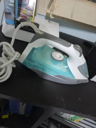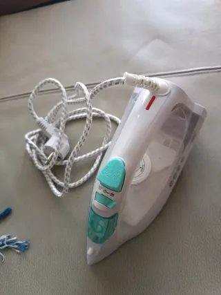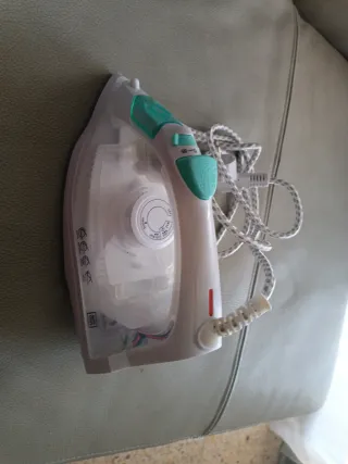 Plancha de ropa en color blanco con detalles en verde turquesa. Ideal para el cuidado de tus prendas. - Cable de alimentación incluido. - Depósito de agua. - Botones de control de vapor y temperatura.