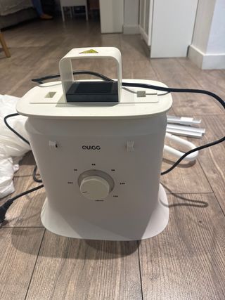 Secador de ropa por aire caliente con brazos y colgadores. Permite colgar prendas directamente con perchas. Ideal para camisas, chaquetas, sudaderas o cualquier tipo de prenda. Funciona correctamente.