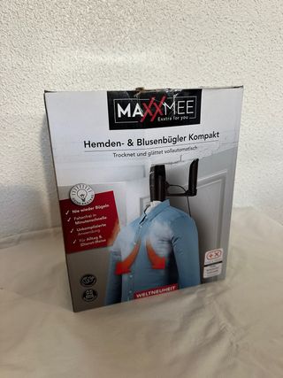 Planchador compacto MAXXMEE para camisas y blusas. Seca y alisa la ropa de forma automática. - No más planchado. - Sin arrugas en minutos. - Fácil de usar. - Ideal para el día a día y viajes.