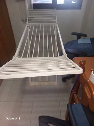 Tendedero de gran tamaño, ideal para secar ropa en interiores o exteriores. Su diseño plegable facilita su almacenamiento. TIPICO DESGASTE DE COLOR POR EL SOL. - Estructura de plástico resistente. - Múltiples barras para colgar. - Base estable.