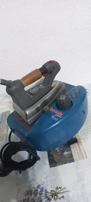 Plancha de vapor Vaporella Polti Special. - Base de plancha metálica. - Mango de madera. - Dial de control de temperatura. - Depósito de agua azul.