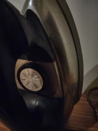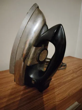 Plancha de ropa antigua, ideal para coleccionistas o decoración. - Diseño clásico. - Cuerpo metálico. - Mango ergonómico de baquelita negra.