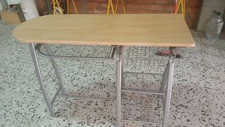 Mesa de planchar con estructura metálica y tablero de madera. Ideal para espacios reducidos. - Estructura metálica resistente. - Tablero de madera ligero y fácil de limpiar. cesta metálicas para guardar la ropa. Y tres estantes metalicos
