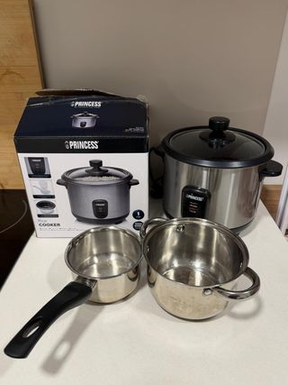 Estudiante que regresa pronto a casa. Todos los productos tienen solo unos dos meses y se han usado muy poco. Aún conservo el embalaje original de la olla arrocera y la plancha. Ideal para estudiantes que quieran preparar sus propias comidas o planchar la ropa en sus habitaciones. Solo olla arrocera: 25 euros Olla arrocera y ollas: 30 euros Olla arrocera y plancha: 45 euros Todos los artículos anteriores: 50 euros No dudes en verlos y probarlos sin compromiso. Puedo entregar los artículos en Sabadell y Barcelona una vez confirmado.