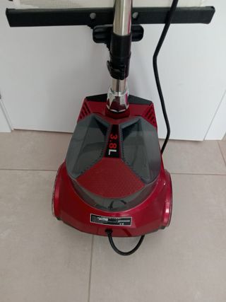 Plancha de vapor vertical para alisar ropa. - Base de color rojo y negro. - Manguera de vapor negra. - Altura regulable.