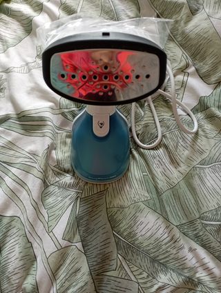 Plancha vertical de vapor con un diseño moderno y compacto. Ideal para alisar arrugas de forma rápida. - Base de planchado metálica. - Mango ergonómico. - Cable de alimentación incluido. Funciona perfectamente pero se rompió el depósito y gotea al usarla.