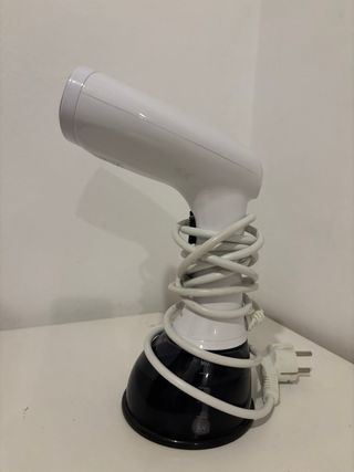 Plancha vertical de vapor en color blanco y negro. Poco uso, funciona perfecto. Precio de compra: 62.30 - Diseño ergonómico. - Base de depósito de agua. - Cable enrollado para almacenamiento.