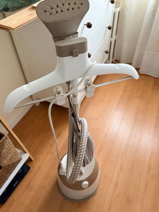Plancha de vapor vertical de la marca Rowenta, ideal para alisar prendas. Modelo: Rowenta Máster Valet. - Mástil ajustable en altura. - Manguera flexible para el vapor. - Base estable con ruedas para fácil movilidad. La compré nueva por 175€.