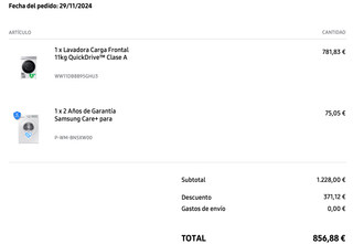 Lavadora Samsung WW11DB8B95GHU3, 11kg, 1400 rpm, gama alta con AI Wash, QuickDrive™, dispensador automático y Wi-Fi. Clase energética A (muy bajo consumo). Motor Digital Inverter silencioso y duradero. Comprada el 29/11/2024, en estado impecable y con muy poco uso. Funciona perfectamente. ✅ Incluye Samsung Care con garantía hasta noviembre 2029. Entrego factura. ⚠️ Recogida con transportistas profesionales; no puedo ayudar. Está en planta sótano, bajando un tramo de escaleras. 📍 Recogida en Sant Cugat, cerca de la estación FGC Sant Cugat Centre. Motivo de venta: mudanza.