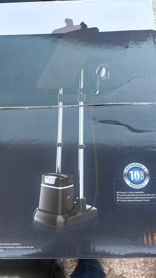 Plancha de vapor vertical para alisar la ropa. - Altura regulable. - Manguera flexible. - Percha integrada. en bien estado , cae un poco Aqua , pero todo función bien