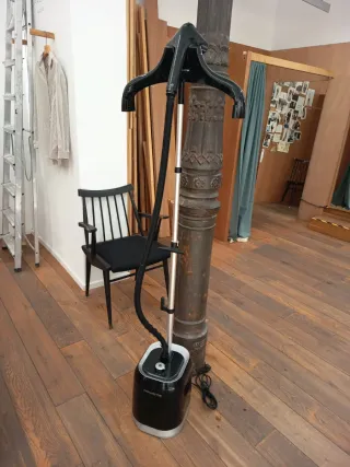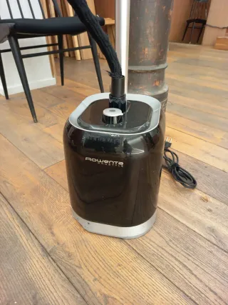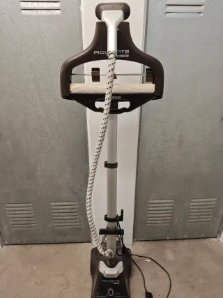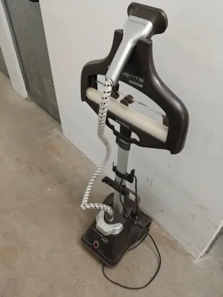Plancha de vapor vertical de la marca Rowenta, ideal para alisar prendas. Modelo: Rowenta Máster Valet. - Mástil ajustable en altura. - Manguera flexible para el vapor. - Base estable con ruedas para fácil movilidad. La compré nueva por 175€.