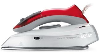 Plancha de viaje Solac Viaggio en color rojo y gris. Es compacta y ligera, ideal para llevar en maletas. - Potencia de 1000W. - Vapor vertical. - Doble voltaje (100-230V). - Base de planchado. - Mango plegable.