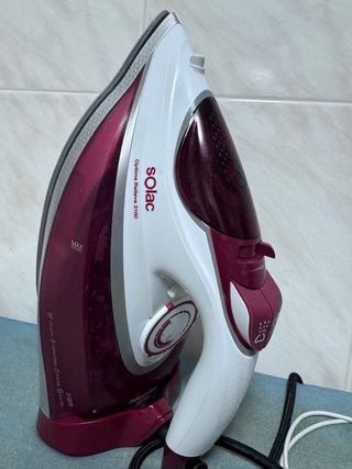 Plancha de vapor Solac con base. - Diseño ergonómico. - Base de planchado. - Depósito de agua.