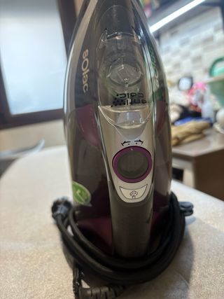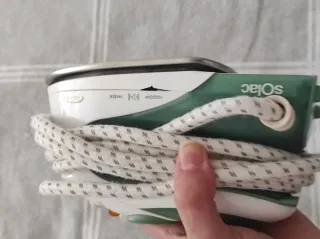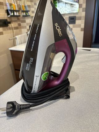 Plancha de vapor Solac en excelente estado, como si fuera nueva. Ideal para dejar tu ropa impecable. - Base de planchado de acero inoxidable. - Múltiples orificios para una distribución uniforme del vapor. - Diseño ergonómico para un agarre cómodo.