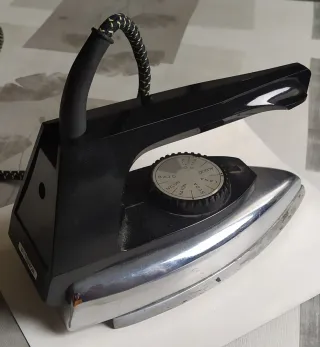 Plancha antigua de los años 60, con un diseño clásico y funcional. Un objeto decorativo o para coleccionistas. - Cuerpo metálico cromado. - Mango de baquelita negra. - Dial selector de temperatura.