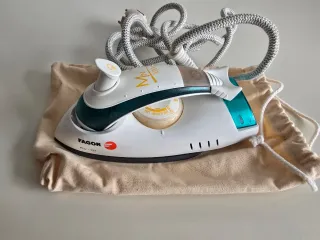 Plancha de viaje compacta de la marca Fagor. Ideal para llevar en maletas. - Diseño en blanco y verde. - Incluye bolsa de tela para guardarla.