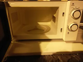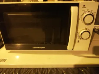 Microondas Orbegozo en perfecto estado de funcionamiento. Su diseño blanco se adapta a cualquier cocina. - Dos mandos giratorios para ajustar potencia y tiempo. - Puerta con ventana para visualizar el interior. - Marca: Orbegozo.