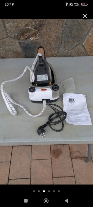 Centro de planchado a vapor con base y accesorios. - Base de planchado con depósito de agua. - Mango ergonómico. - Dial de control de temperatura. - Cable de alimentación. - Taza medidora. Descripción Plancha de vapor con cable de alimentación y manual de instrucciones. Sistema de planchado de diseño y compacto garantiza una constante salida de vapor para conseguir su resultado. Excelentes capacidad de agua, un litro Diseño ergonómico con mango de corcho. Base metálica para un deslizamiento suave. Dial de control de temperatura. Incluye accesorio dosificador y su caja original