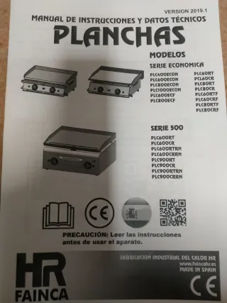 Manual de instrucciones y datos técnicos para planchas HR FAINCA. - Serie Económica. - Serie 500. - Fabricación Industrial del Calor HR. - Made in Spain.
