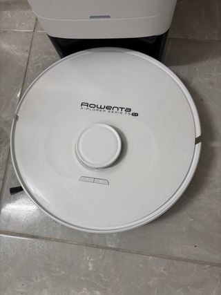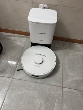 Robot aspirador de la marca Rowenta, diseñado para la limpieza automática del hogar. t - Color blanco. - Base de carga incluida.sta como nuevo pero sale un error de la última fotoodos los accesorios de vaciar automático y de fregar