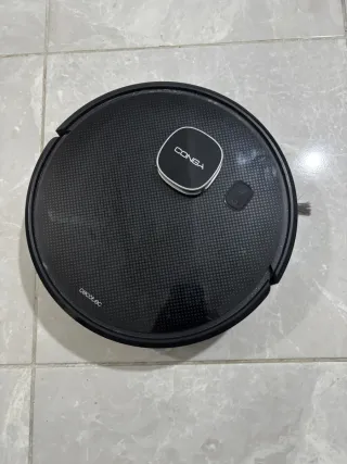 Robot aspirador Conga con diseño moderno y acabado en negro. Enciende y parece que tiene problemas de una rueda , solo anda de un lado, para piezas o arreglar. - Superficie con patrón de puntos. - Logo de la marca en la parte superior. - Botones de control integrados