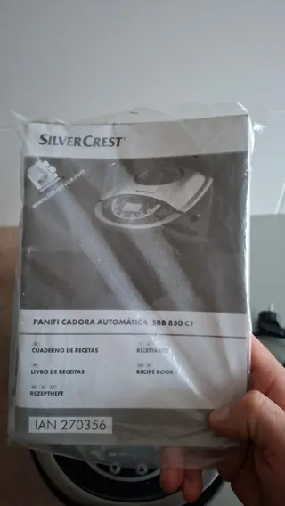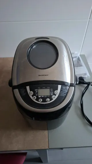 Panificadora Silvercrest en acabado plateado y negro. - Diseño moderno y compacto. - Panel de control digital con pantalla. - Ventana superior para observar el proceso.